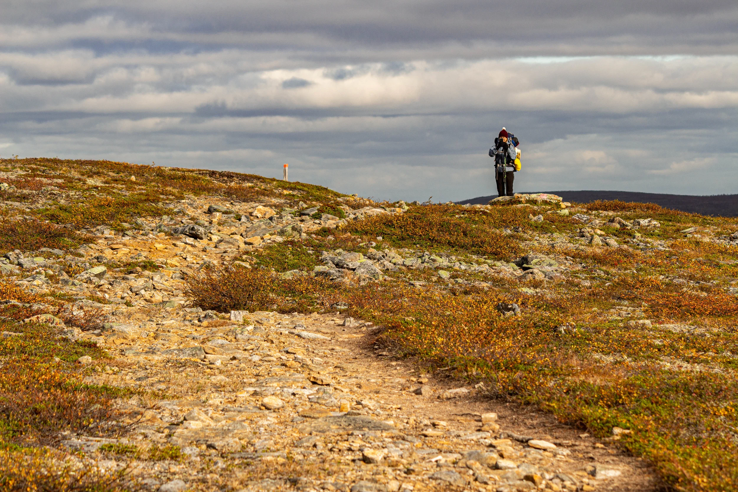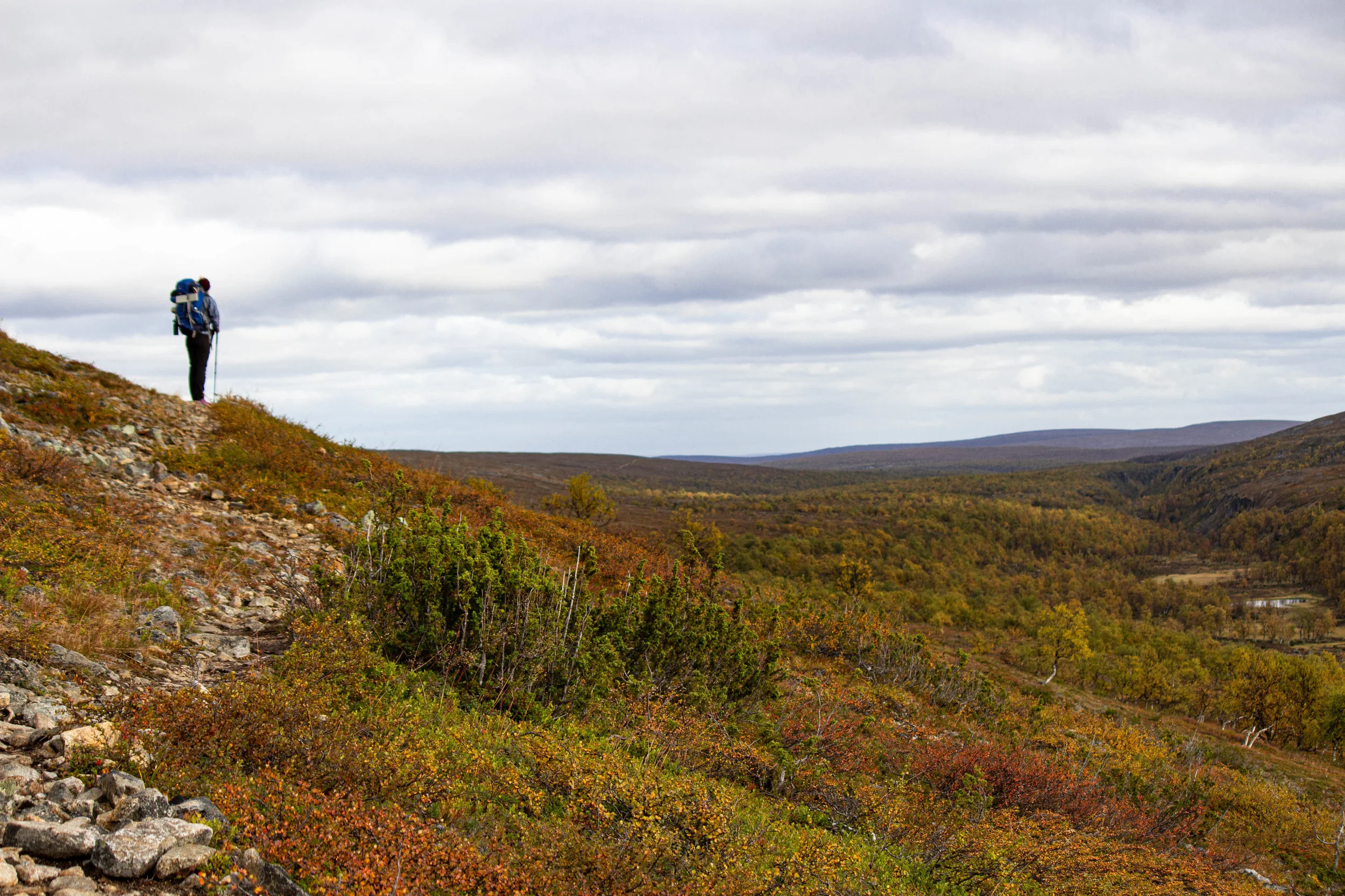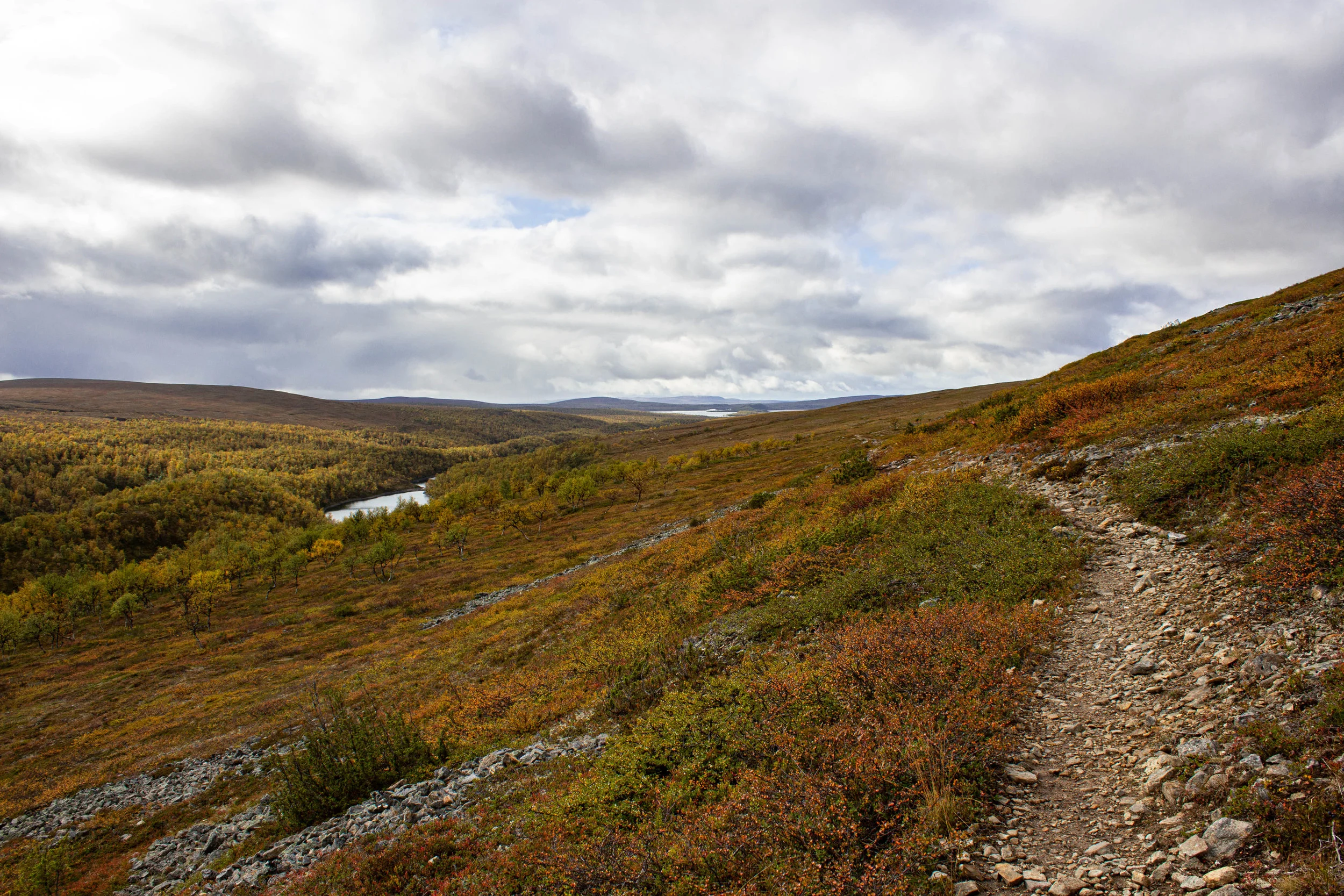 Muutaman kilometrin jälkeen sade onneksi lakkasi, ja väsymys ja huonovointisuuskin oli jo unohtunut tunturimaisemia tutkaillessa. Vaelluksemme aikana ei satanut enää kertaakaan näiden ensimmäisten kilometrien jälkeen. Ruskakin vaikutti olevan parhaimmillaan! Ensimmäisen päivän kuvasaldo jäi kuitenkin rivakan kävelytahdin takia heikoksi, mutta tilanne korjaantui seuraavan kolmen päivän aikana.