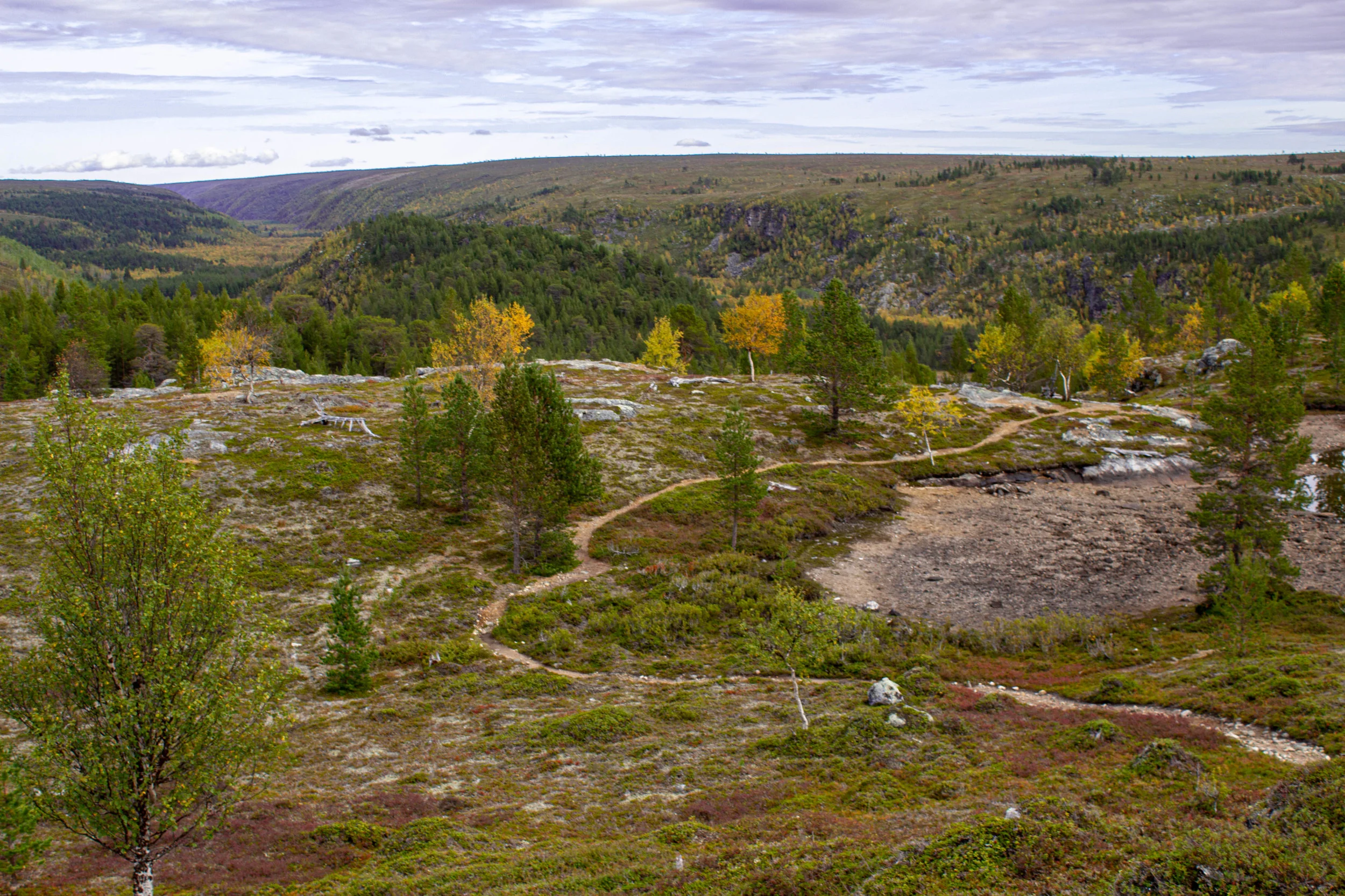 Kevon karttaan on merkitty selkeä havumetsän raja, joka kulkee Kevojoen vartta molemmin puolin. Lähestyessämme Kevojokea maisema alkoikin vehreytyä huomattavasti. Avotunturipaljakan ja ruskan väreissä läikehtivien tunturikoivikkojen jälkeen oli ihanaa piipahtaa välillä satumaisessa havumetsässä. Havumetsän tuoksu on myös todella rauhoittava.