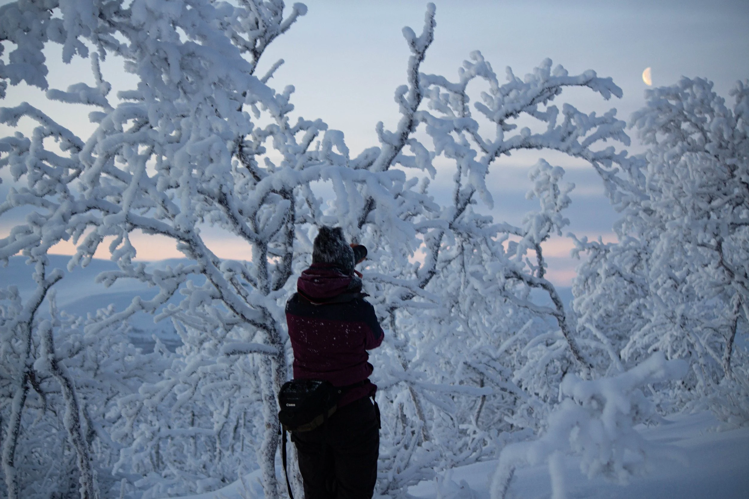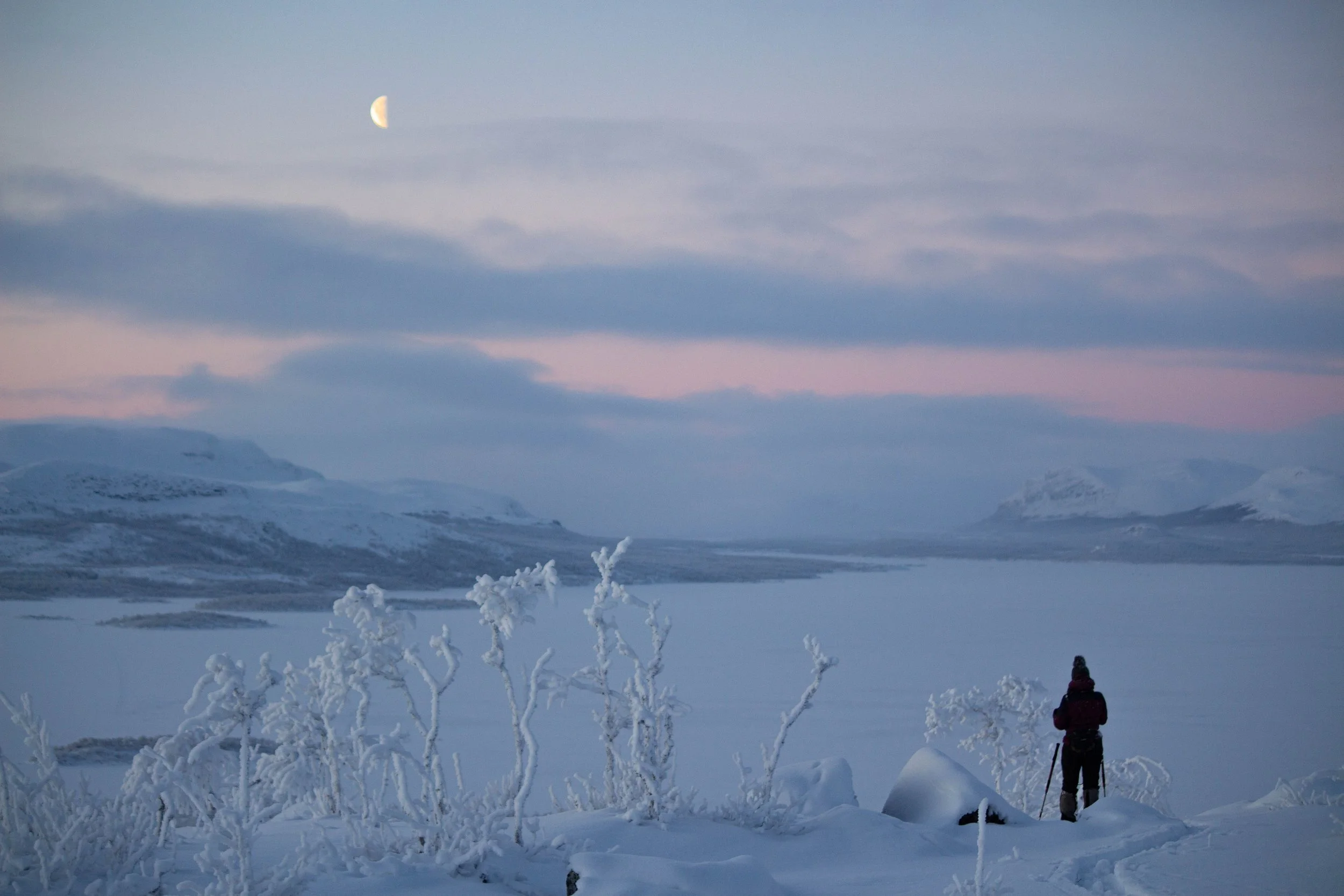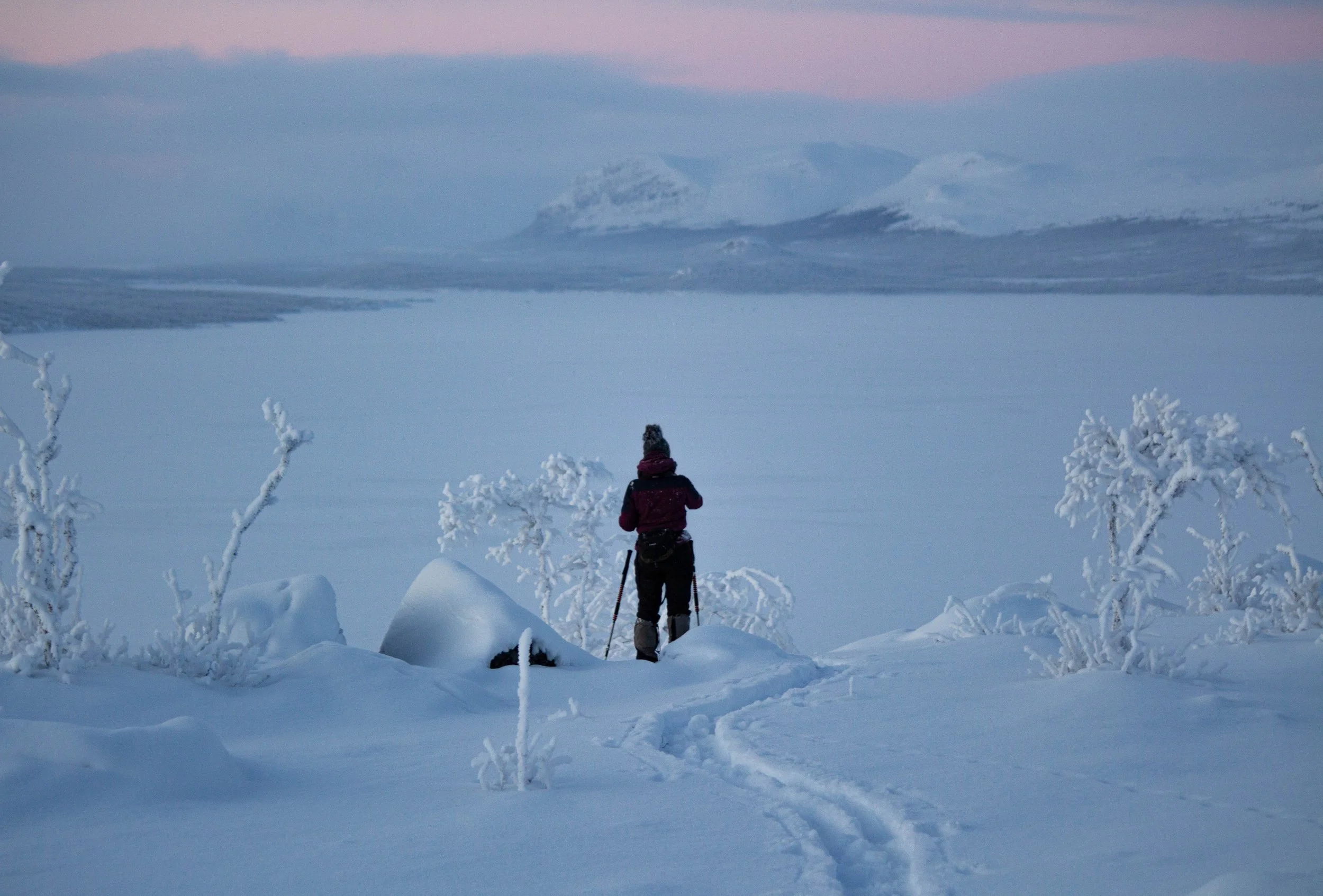 Vaaleansinisen, -punaisen ja -violetin maalaama unenomainen tunnelma on jatkunut Kilpisjärvellä jo yli viikon. Pakkasasteet ovat pysytelleet kahdenkympin tienoilla, välillä hipaisseet jopa kolmeakymmentä.