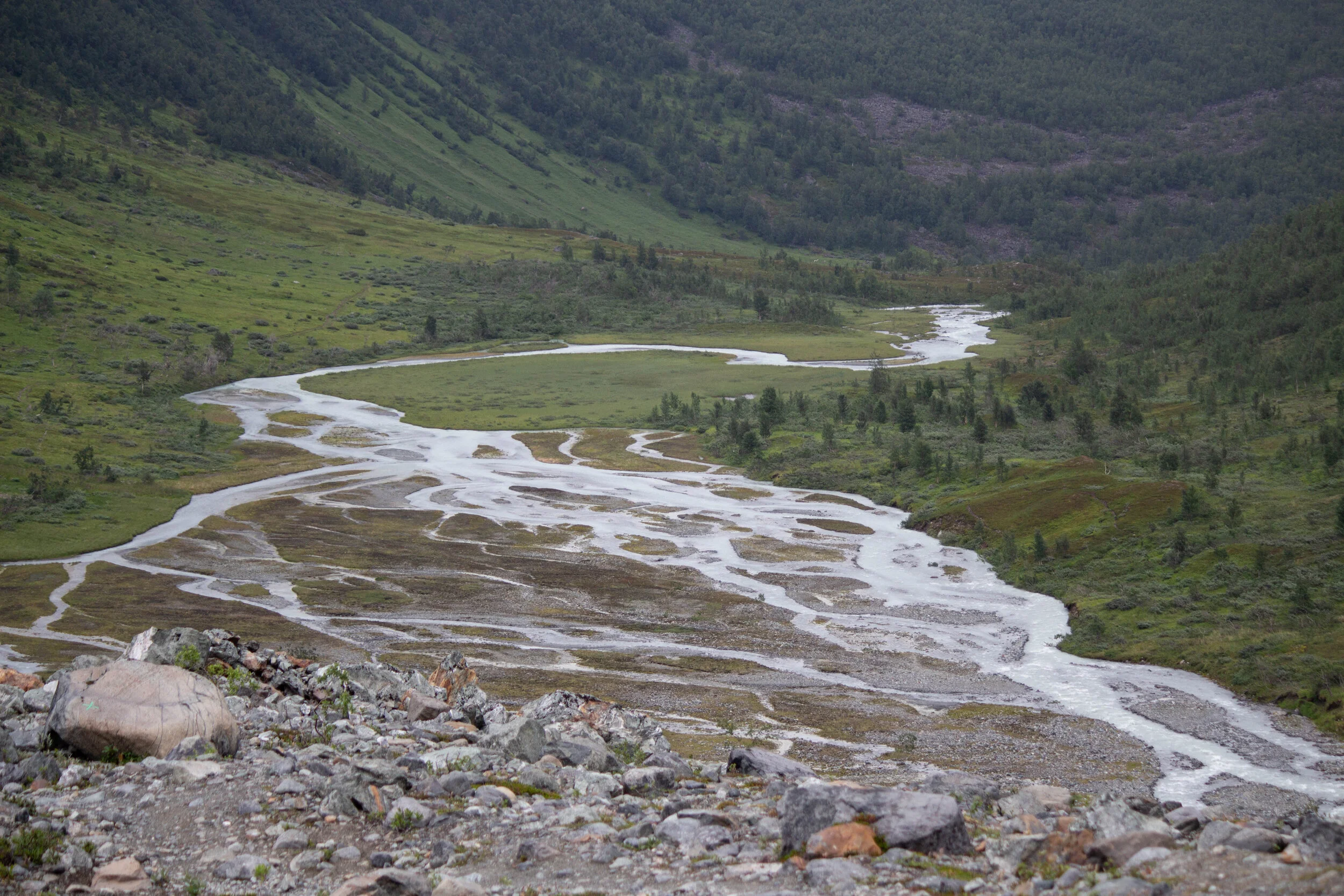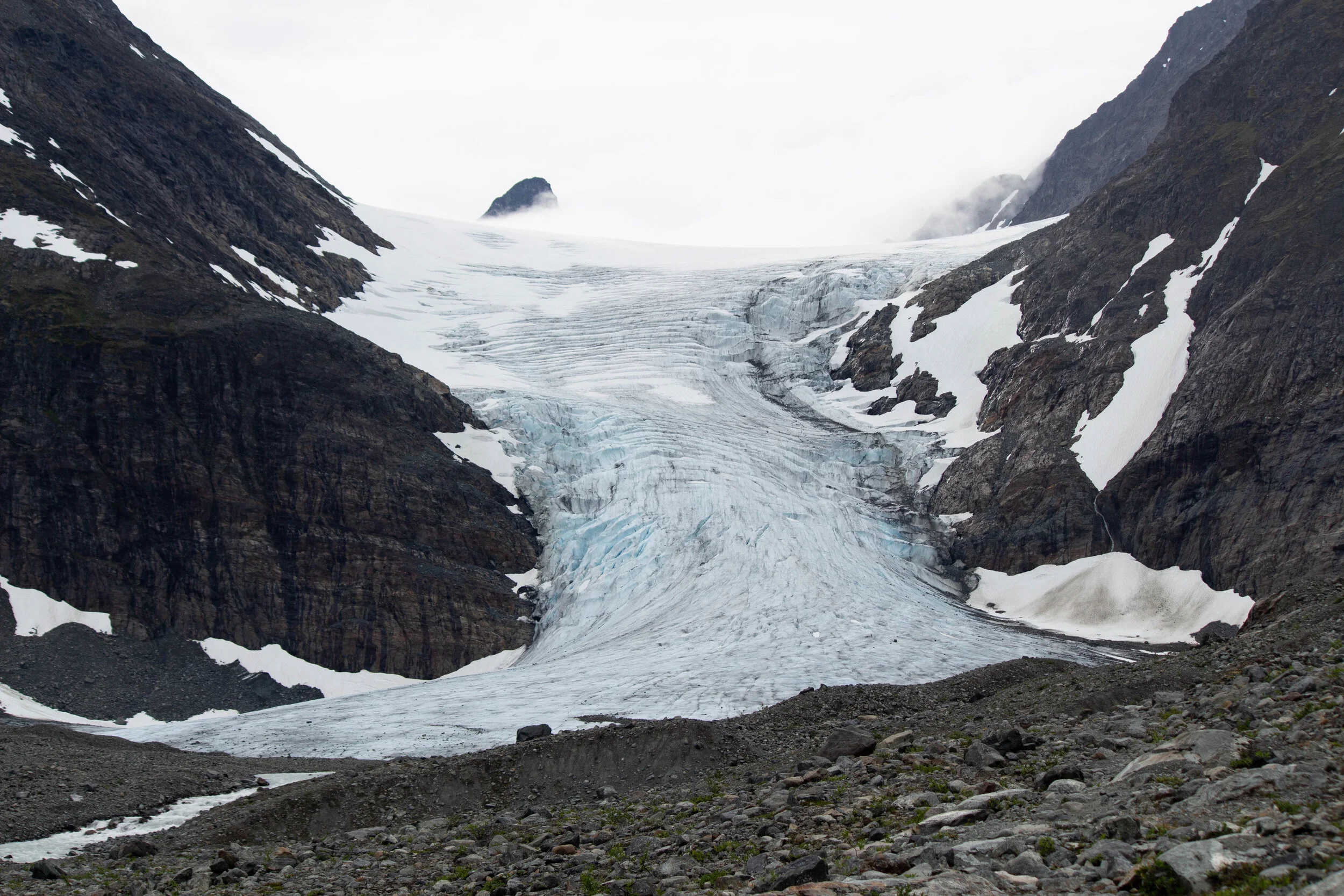 Jos viikon muut retket tuntuivat kevyiltä iltakävelyiltä, niin tämä retki sai pohkeet nopeasti jumiin. Norjan puolella retkeillessä nousumetrejä kertyy runsaasti joka kerta, sillä retkireitit lähtevät hyvin usein nousemaan heti aluksi ylöspäin. Niin tekee myös tämä Steindalsbreenin jäätikölle johtava reitti.