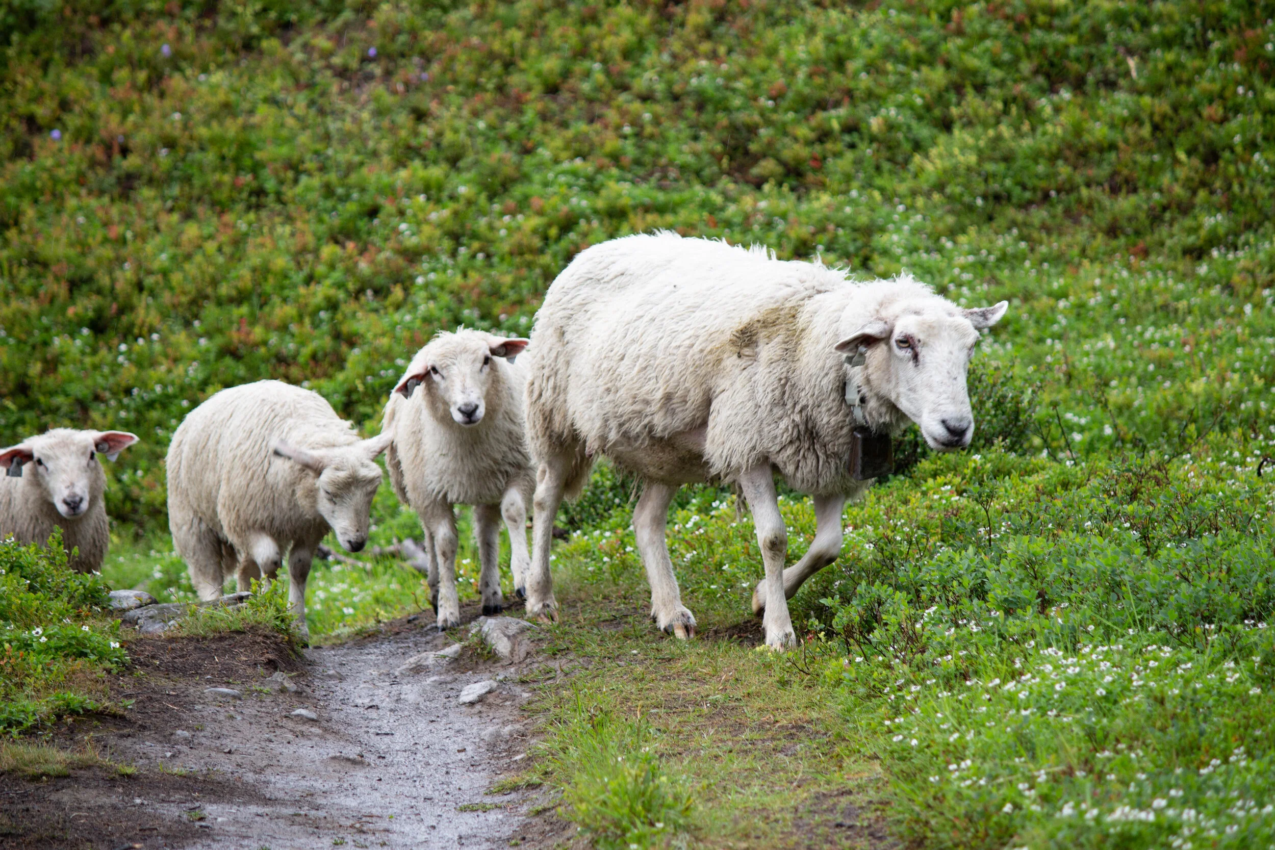Hytten jälkeen maasto onkin jo paljon helppokulkuisempaa eikä nousua ole enää niin paljon kuin alkumatkasta. Jäätikköä lähestyessä reitin varrelle osuu myös kaunis laakso, jossa oli tällä kertaa lampaita laiduntamassa. Lampaita ei muuten kannata mennä häiritsemään ainakaan koiran kanssa, sillä emolampaat voivat olla kovinkin suojelevaisia pikkuisiaan kohtaan. Muutoin määkijät vaikuttivat oikein leppoisilta tyypeiltä ja antoivat ohittaa polulla kun rauhakseen kuljimme.