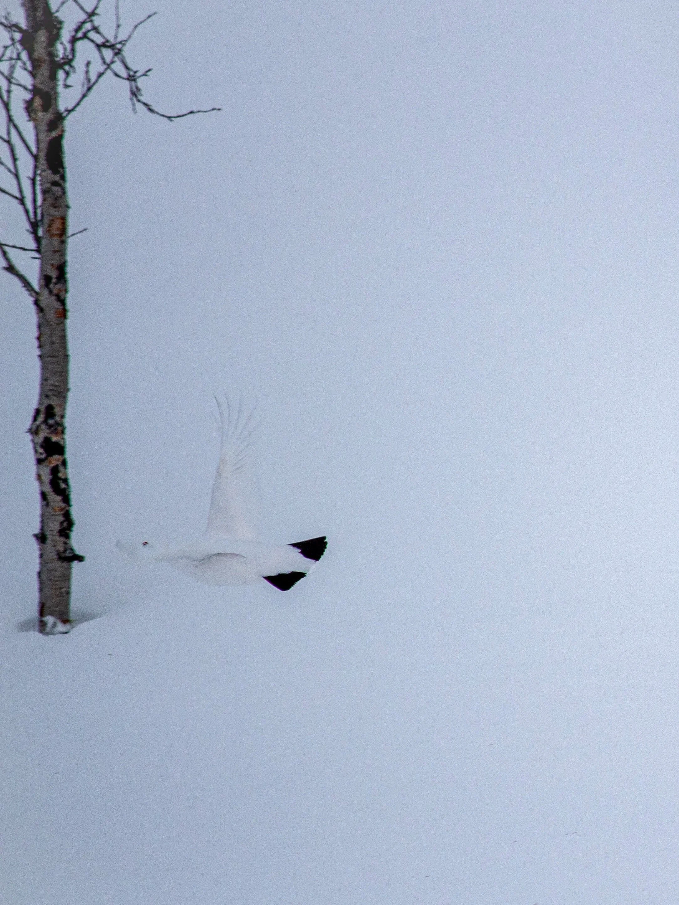 En tiedä mikä mahtaa olla riekon kiihtyvyys, mutta lentävästä riippanasta en ole onnistunut saamaan vielä omaa silmää miellyttävää kuvaa. Aina on jokin risu tiellä tai valo tulee väärästä suunnasta, lintu on oudossa kulmassa tai suttuisen epätarkka. Paras yritys tähän mennessä onnistui huhtikuun alussa eräällä riekkohiihdolla.